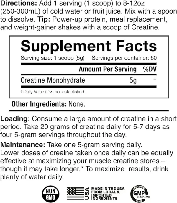 الكرياتين أحادي الهيدرات فائق النقاء  من مصدر ألماني بدون مواد مالئة أو زغب ، يعتبر الكرياتين ضروريًا إلى أي لاعب قوة. ويعتبر الكرياتين أحادي الهيدرات إلى حد بعيد واحدًا من أكثر المواد التي أثبتت جدواها ، يعمل على دعم حجم العضلات وقوتها.